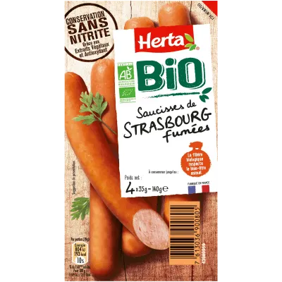 Découvrez les saucisses de Strasbourg BIO Conservation Sans Nitrite HERTA ! Retrouvez le goût unique des saucisses HERTA dans une recette BIO 100% pur porc, au goût délicatement fumé. Des saucisses croquantes à l'extérieur et moelleuses à l'intérieur, qui plaisent à tous les gourmands ! Pour les enfants de moins de 4 ans, coupez la saucisse dans le sens de la longueur puis en tout petits morceaux afin de prévenir les risques d’étouffement.